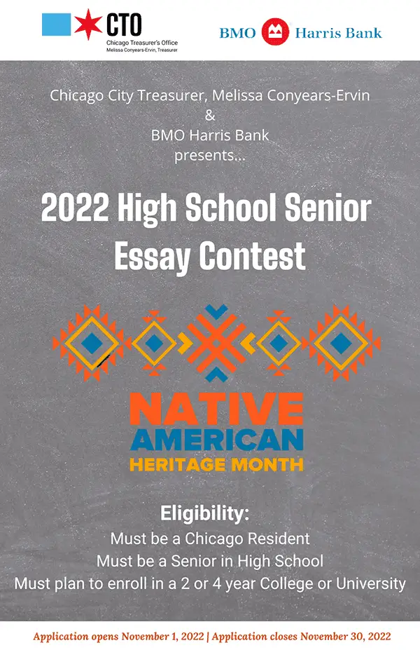 IMMEDIATE RELEASENovember 9, 2022 CONTACT:Brian Berg (312.742.2733/312.282.8260)Brian.Berg@cityofchicago.org Chicago – Chicago City Treasurer Melissa Conyears-Ervin announced today she has expanded the Heritage Month Scholarship Essay Contest