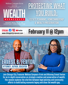 Join Chicago City Treasurer Melissa Conyears-Ervin and Attorney Ernest Fenton for an in-depth conversation on strategic creation and preservation of wealth. This session explores the vital link between legal planning and community efforts to build lasting economic legacy and close the wealth gap. Click here to watch live!